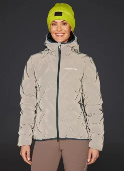 Fun exclusive warm padded jacket with a large cozy hood. Water- and wind repellant main fabric with both shiny and matte surfaces.