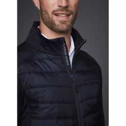 Sporty hybrid unisex jacket with comfortably padded body and stretch tech fleece sidepanels and sleeves.