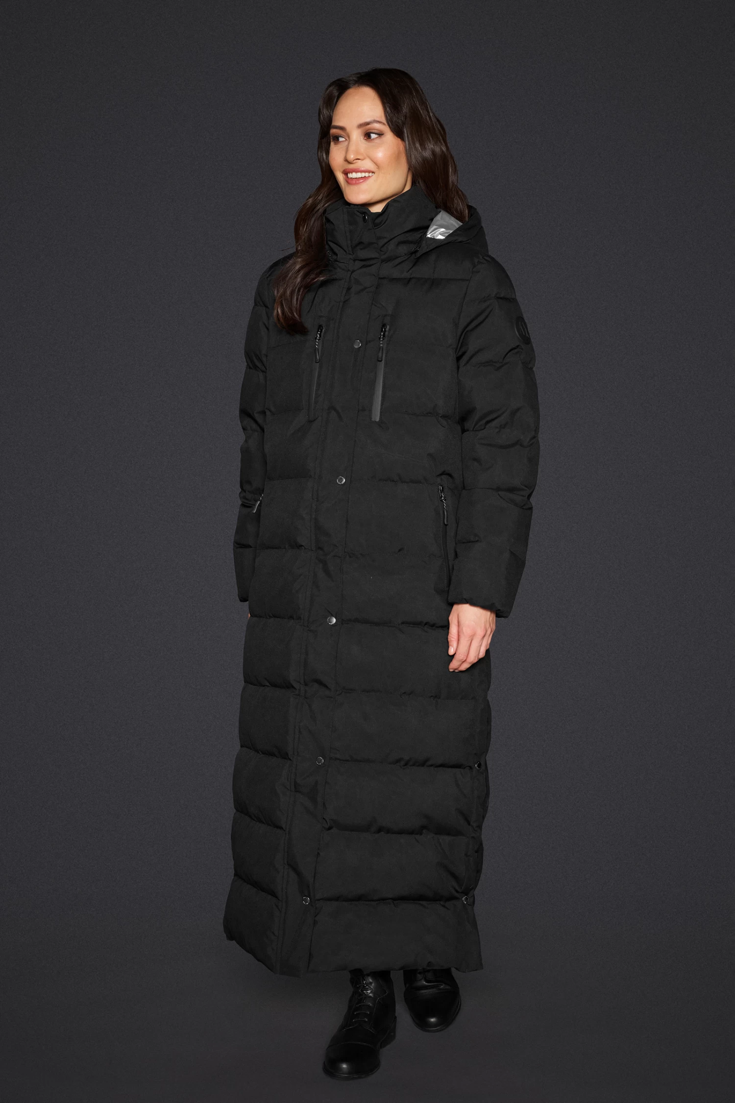 Long warm padded coat with high side slits. Reflective details, multiple front pockets with waterproof zipper closure. Protective detachable hood with silver lining.