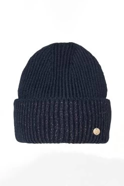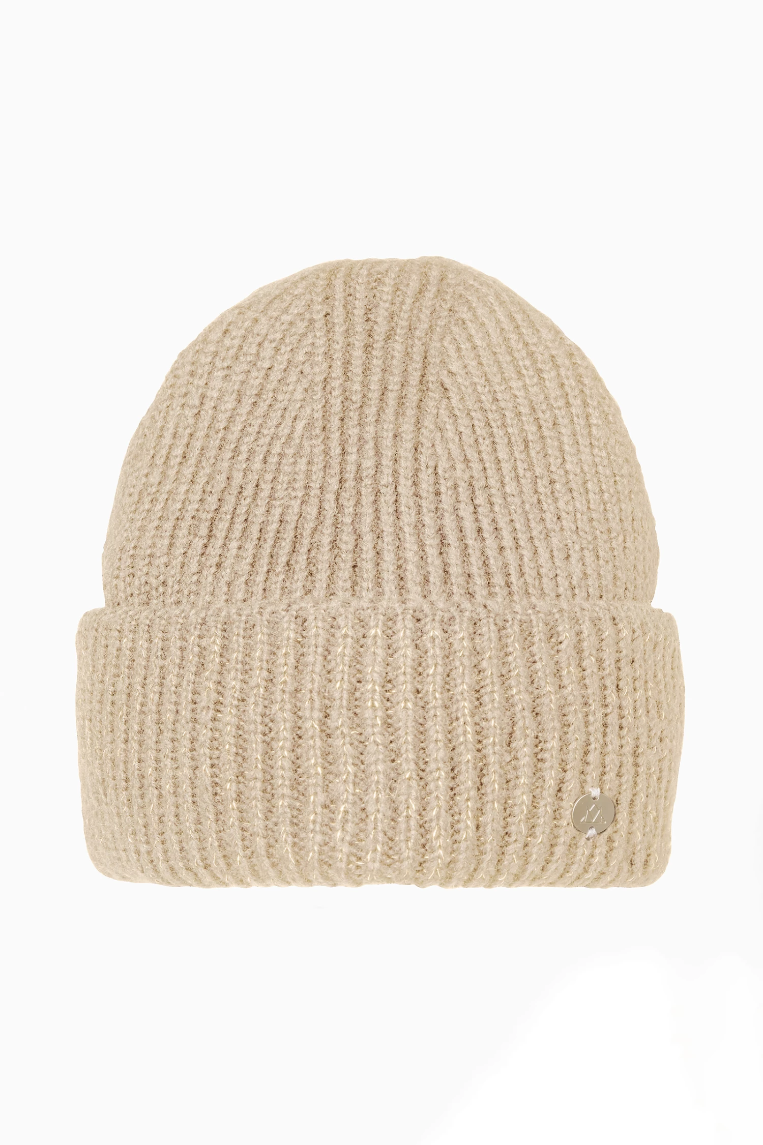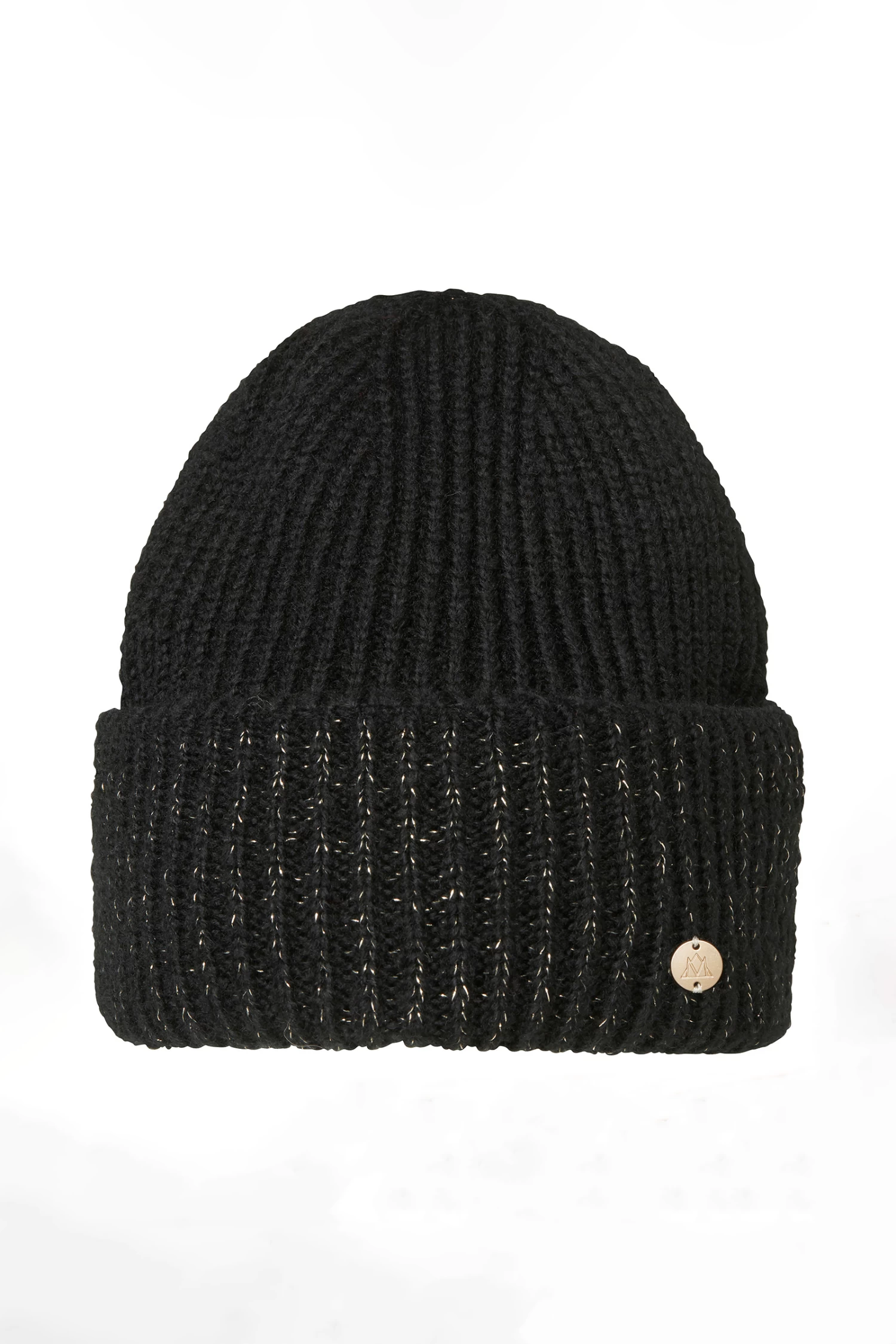 Cozy double folded knit hat with sparkling lurex thread and fancy MH logo badge.